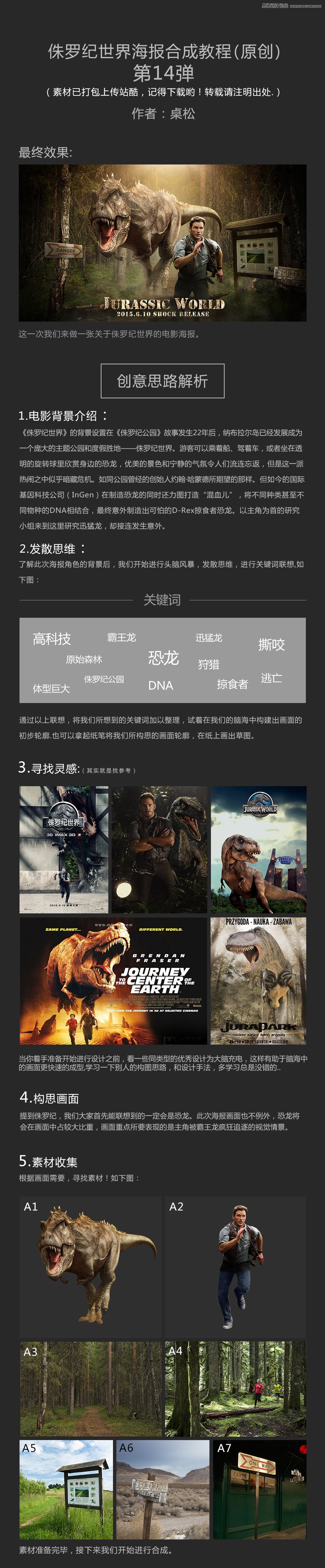 本教程主要使用Photoshop合成超酷的侏罗纪世界电影海报,提到侏罗纪世界,我们大家首选能联想到的一定会是恐龙,此次的海报合成画面也不例外,恐龙将会在画面中占较大比重,海报画面中重点要表现的主角被霸王龙疯狂追逐的视觉场景,喜欢的朋友让我们一起学习吧。