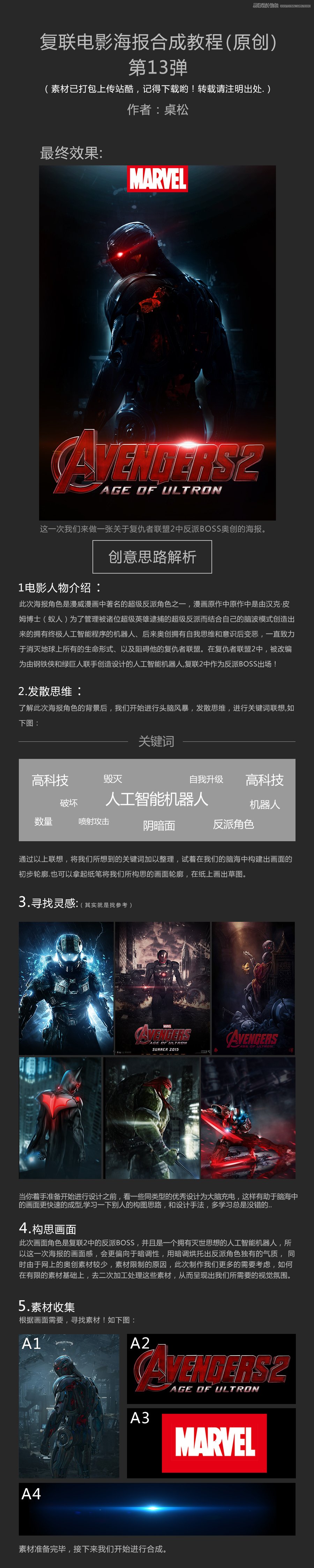 本教程主要使用Photoshop合成以奥创为主元素的复联2电影海报,本次海报设计中的主题元素是电影的反面人物BOSS,是一个拥有灭世思想的人工智能机器人,所有这次海报的设计中,主风格选择了暗色调,用暗调烘托出反派角色独有的气质,喜欢的朋友一起来学习吧。