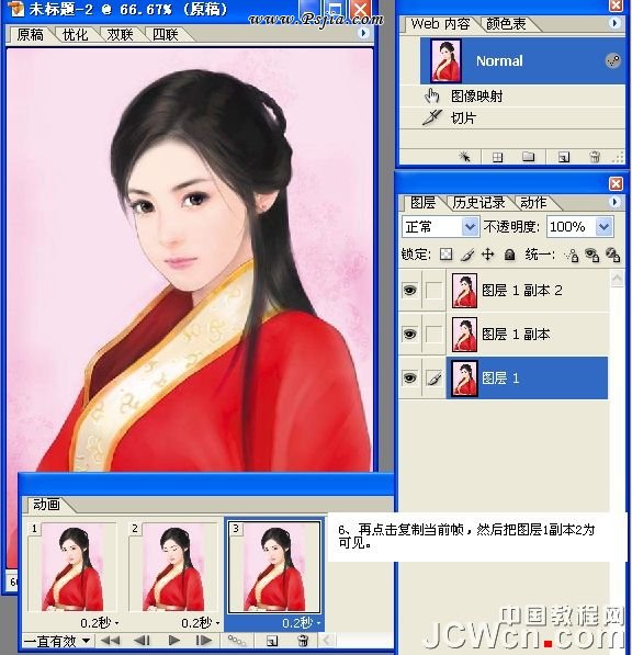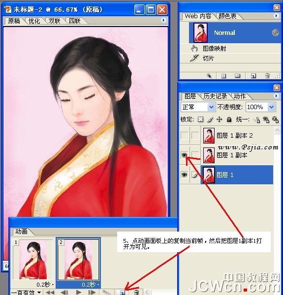 5、点动画面板上的复制按钮,把当前帧复制一层,把中间图层显示出来,如下图。 6、再点击复制当前帧按钮,然后把最上面的图层显示为可见,如下图。