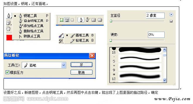 如下图所示设置钢笔和画笔,设置好之后,新建一个图层,选择钢笔工具,然后在图中点击右键,就出现了上图里面的描边路径,选择画笔,勾选模拟压力。