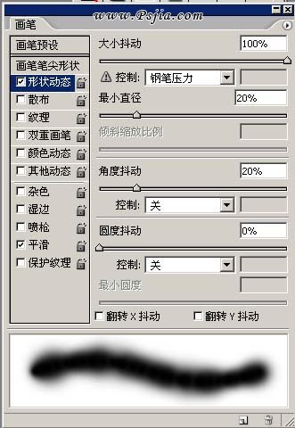 形状动态:大小抖动 100%,最小直径 20%,角度抖动 20%。