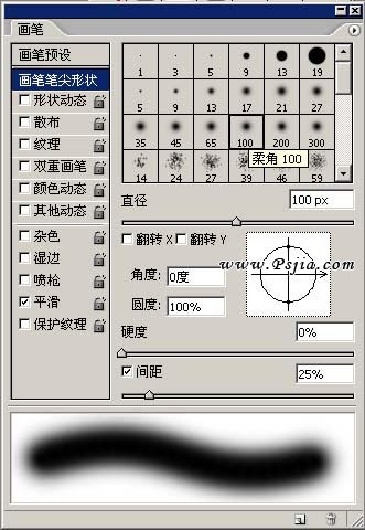 画笔笔尖形状:笔尖类型 柔角100 ,直径 100Px,间距 25。