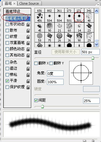 画笔定义讲完了,我们开始进入正题:画笔预设的应用。按f5调出画笔预设对话框,在不勾选任何任何的情况下,选择我们刚才定义的画笔