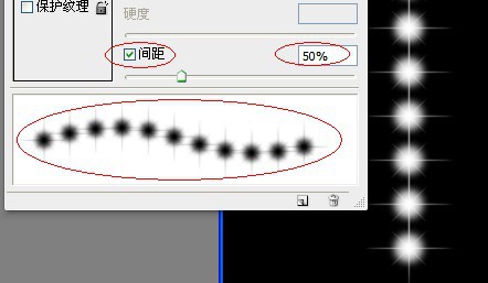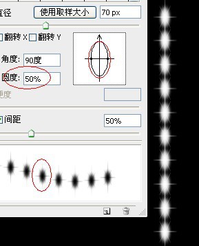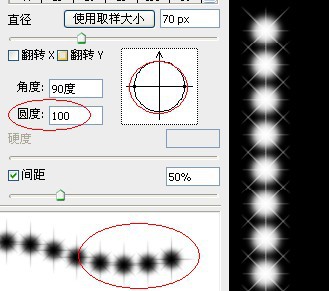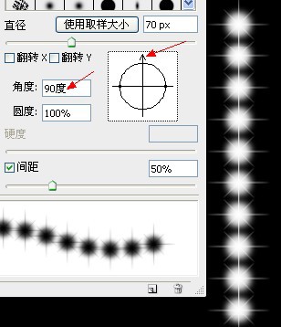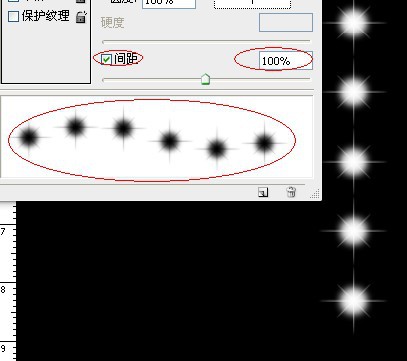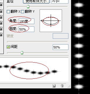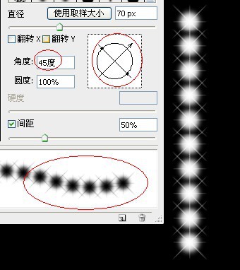 我们可以看到间距是调整星星之间的距离的 距离越大星星距离越大 这是间距100时的效果: 间距上方的角度是做什么用的?很明显是调整笔刷的角度 随着