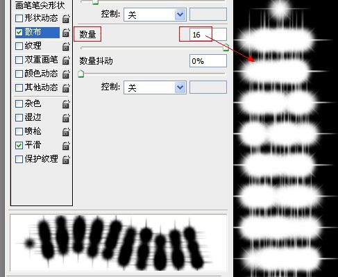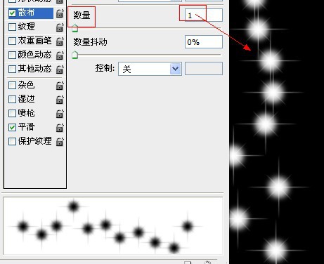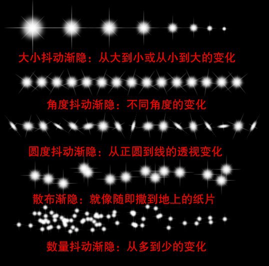 如果配合形状动态的大小抖动和角度抖动,可以形成以下效果: