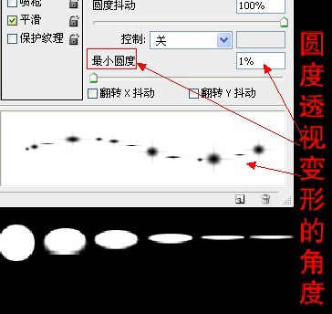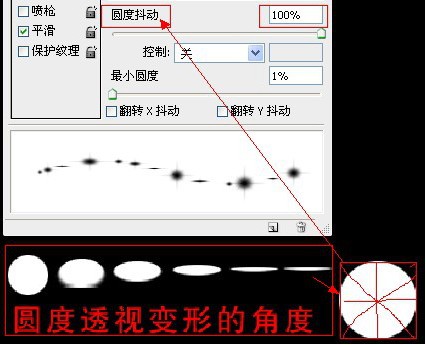 从下图实例中,我们可以看出,圆度抖动同样是笔刷透视的变化,数值越大,变化越大
