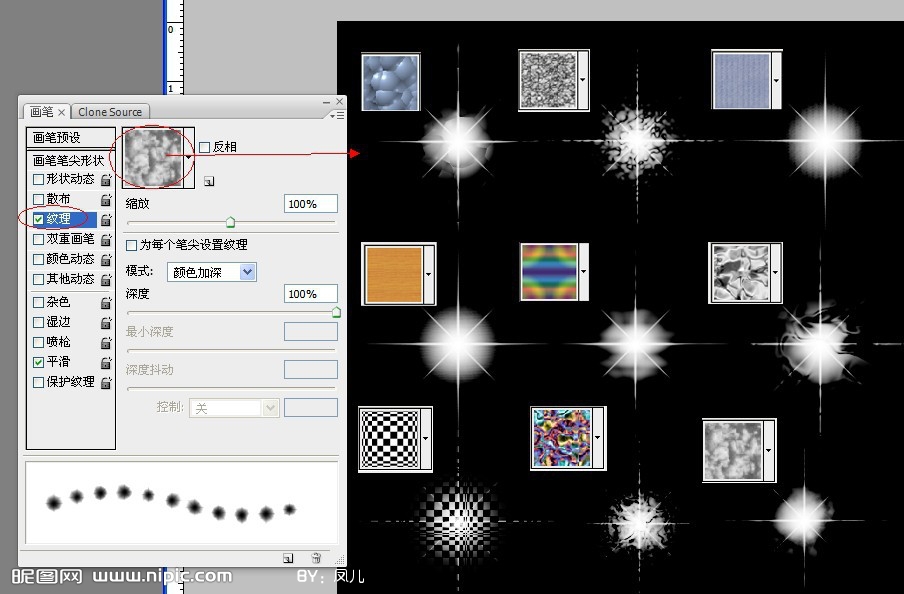 纹理是什么:就在我们的笔刷上加上各种图案,以下是各种纹理的不同效果: