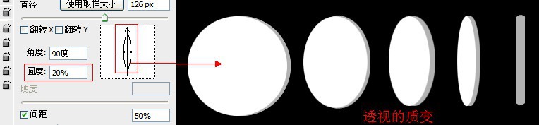 其实圆度的变换,只是一个笔刷的的透视变换,就像一个圆盘从正面到侧面的透视效果,如图所示: