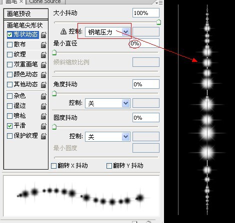 形状动态中,大小抖动,就是笔刷从大到小或从小到大的大小变化