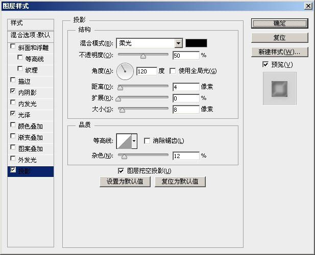 8、双击“Base2”层,打开图层样式窗口,设置内阴影。具体设置请参考下图。