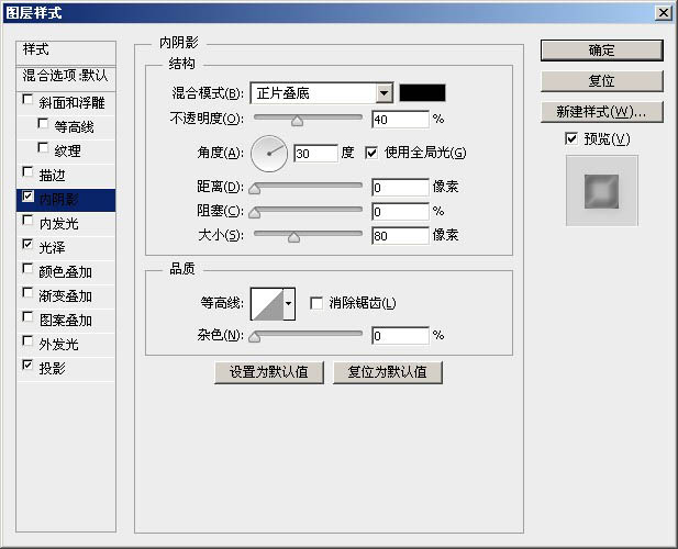 9、双击Icing层,设置内阴影,具体设置请参考下图。