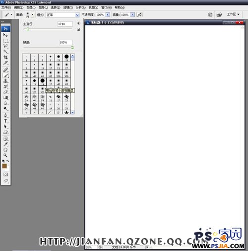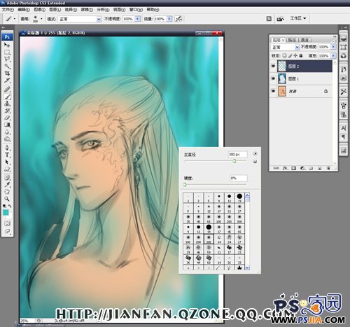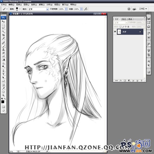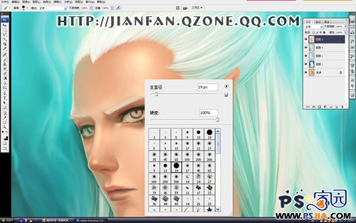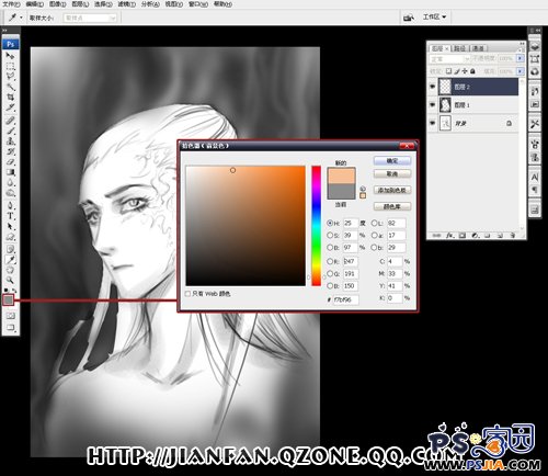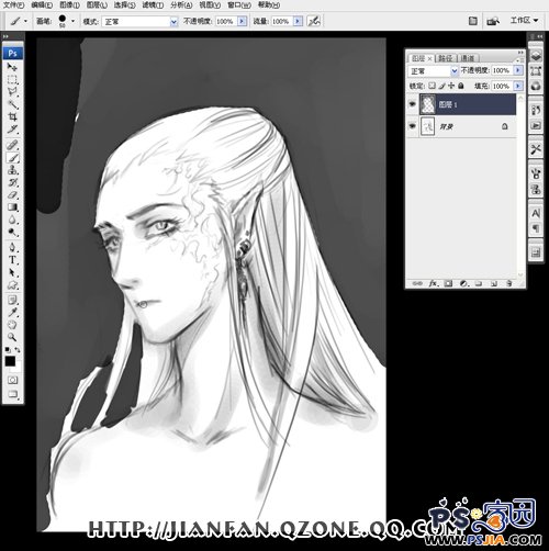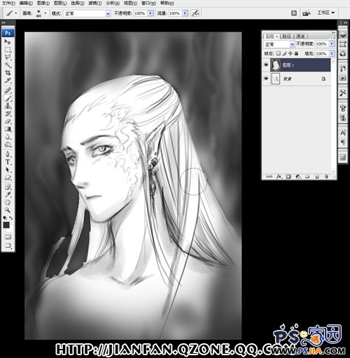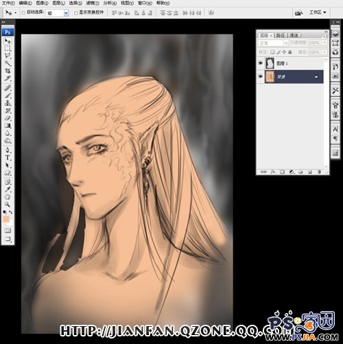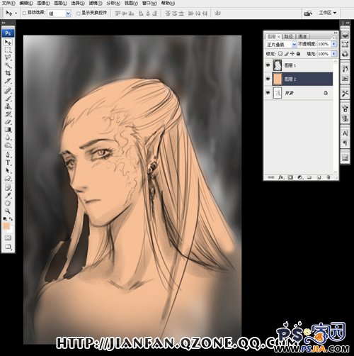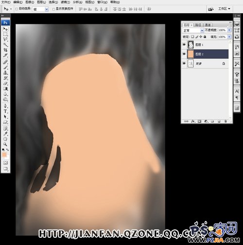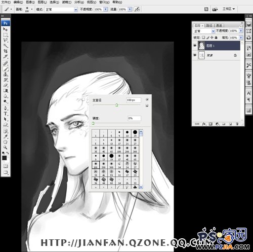 2. 建好画纸,点画笔工具,按右键点出笔刷框,选前面提到的19号笔刷。用来起草稿。PS给它名称是“喷枪钢笔不透明描边”。(把鼠标停放在笔刷上一会儿就可以看到笔刷名称)如图4。 3.左手可一边用键盘的快捷键大括号“[”“]”两个按键来控制画笔直径的大小。确定好基本构图和人物形态与光线。人物风格按自己喜欢的顺手的画。草稿就画完了。(画画时可多用快捷键,可以提高绘画速度。下面会提到很多快捷键,要多记多练习) 4.新建一个层,在层上用画笔涂灰,沿人物边缘任意涂,不要涂灰人物。先不用管色彩。[按键盘上的“F”键,面画会全屏显示,按一次、两次、三次“F”都有不同的画纸满屏和全屏显示。画面缩小放大除了左边工具条中的放大镜外还可以使用方便的快捷键“ctrl -”与“ctrl + ”,(键盘右边)利用加减号键能方便快捷的缩放画面,提高查阅速度。] 5.再选用另一个有羽化边缘的笔刷。如图7,笔刷框中的第五行第一个。 6.一边画笔大小,随意画出烟雾状,要自然,大致画完就行,先不用画太细。不用拘谨人物边缘。(图8) 7.开始填大色块,新建一层,点左边的“前景色”就会弹出色彩框。调选皮肤色。 8.按快捷键Alt+Delete填充前景色。(ctrl+Delete是背景色) 9.把这一层填充好的皮肤色,鼠标点住拉动到下面一层,对比图10与图11中的图层顺序。