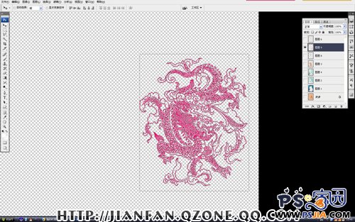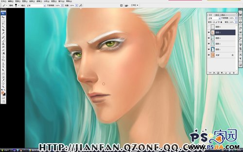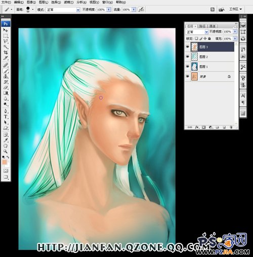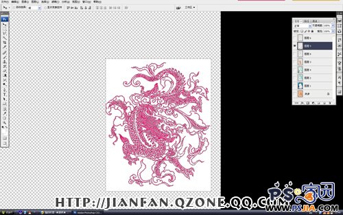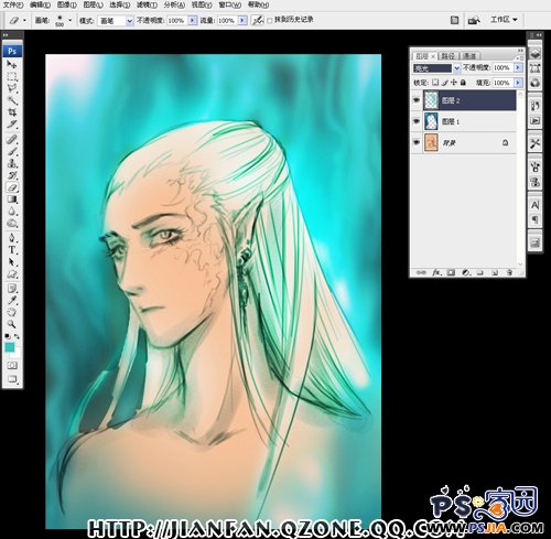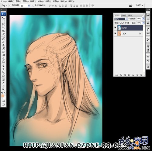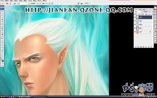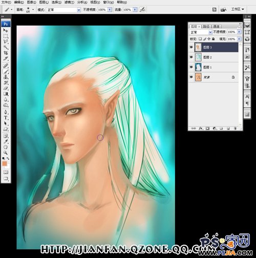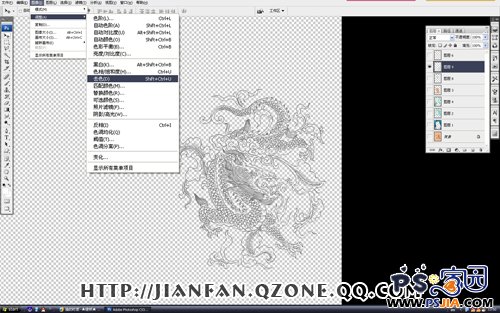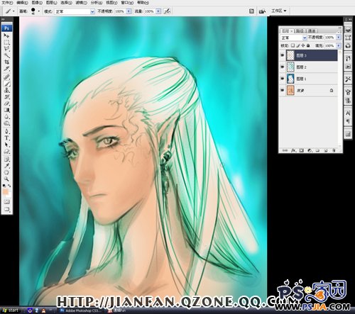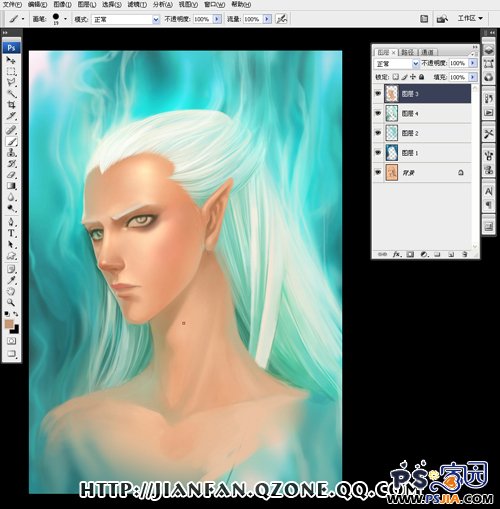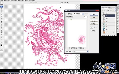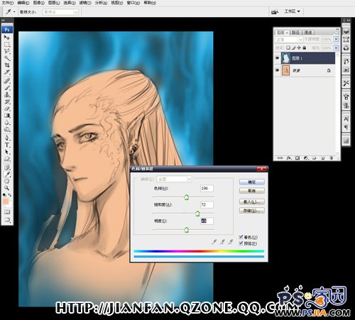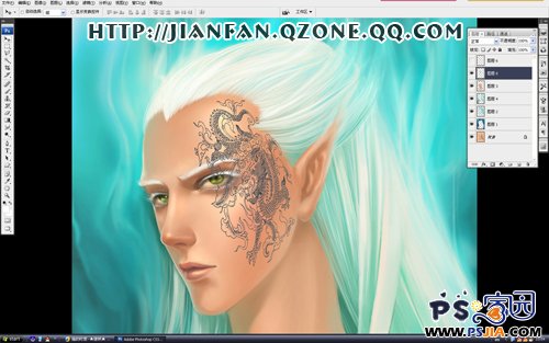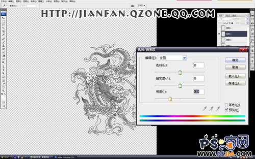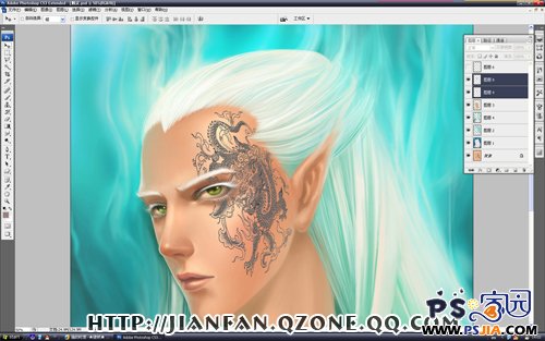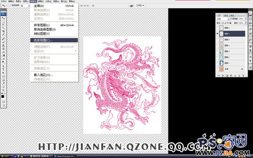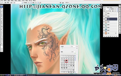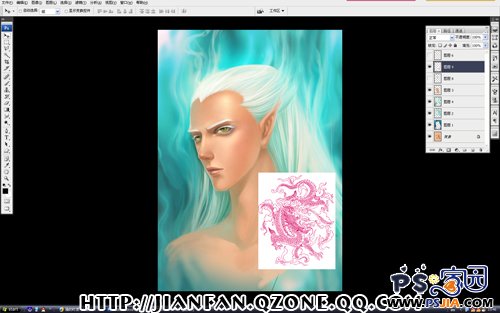 10.把一层图层模式改为“正片叠底”,这一皮肤层就会变透明,可以看到下面的线稿。 11.按ctrl+e,让这一皮肤层往下一层合并。图13,这一层就会变成皮肤色。 12.选中上一层的背景。用“色相/饱和度”调出需要的色彩。“色相/饱和度”在菜单中的“图像” →“调整” →“色相/饱和度”。也可用快捷键“Ctrl+U”快速打开。记得要打开框中右下角的“着色”勾,这样就能为黑色变色。 13.调好色彩后把这一层的图层模式改为“强光”。色彩更明亮。注意每种图层模式的效果不同。 14.新建一层,用常有羽化边缘的大号(300)笔刷,在人物边缘与皮肤阴影处轻轻的画上几笔与背景差不多的色,这样能让人物与背景相容,色彩不能太单独,色彩之间要互相感染才能让画面内容相容合,不会太跳或各不相干。 15.把这一淡彩层的图层模式改为“亮光”,可以看到原先较灰的变成很亮眼的蓝色。连线条也变色了。 16.基本色彩就好了,现在开始开始细画,这个时候要细心。画笔跟图4中的一样,下笔时注意脸部肌肉结构走向,用大括号缩放画笔,在步聚3中有提到。用画笔一边细化时可以一边按快捷键“Alt”变成色彩吸管一边吸周围的色彩来画。 17.根据光影,把脸部皮肤画完。注意要与环境的色彩容合来画。注意观察细部的色彩变化。可以用图1中的两种笔刷混和来画。 18.把大致的皮肤全画完,然后把画面反转过来看结构有没有出错,这一步聚非常必要。因为人的眼睛视线是不对等的,在刚开始画线稿时也需要这样,经常反转画面来察看结构是否出错。及时的调整避免少出错。在菜单“图像” →“旋转画布” →“水平翻转画布”。 19.把画面旋转回来。再细致的修改结构后开始画头发。头发是另外新建一层,在皮肤层的下面。图21中的图层4,头发的笔刷与图4中的一样。注意下笔的轻重,还要与背景结合着来画。画出细微的烟雾。 20.选取淡红色,用大号的有羽化边缘的笔涮轻轻画了一笔,脸上有了烟脂色,让脸部皮肤色彩丰富些。然后调整细画与周围容合。脸与头发也开始容合画。 21.放大画布,画脸部细节。用图23中的笔刷画细节。 22.画眼睛,睫毛一根根的画。由内向外画,依然要注意结构的走向,画出眉毛和睫毛,唇部。眼是人的灵魂之窗,一定要注意人物眼神的刻画。这类人物肖像的画更要注重对眼睛的绘画。 23.再最后局部的修改。还小部位的高光。 24.添加刺青。在素材中找来一张龙的图案(最好能自行绘制),注意下面的刺青方法处理。 25.除了刺青这一图层外的图层全部隐藏,把图层框里的眼睛点掉就行。需要时再点开。现在全部点掉,除了龙这一层。打开菜单中的“选择” →“色彩范围”。 26.在弹出框来后,用吸管点取白色的部位,这是需要去掉的部位。然后按确定。 27.可以看到白色部份己经被选取出来,这就是为什么要隐藏掉其他图层的原因,怕会选到其他图层的白色。 28.然后按键盘的Delete键,把白色的部份去掉,这样就提取出了龙的图案。 29.再把这龙的色彩去掉,在菜单的“图像” →“调整 ” →“去色”。让龙变成灰色。 30.按Ctrl+U用“色彩/饱和度”调整“明度”降低。