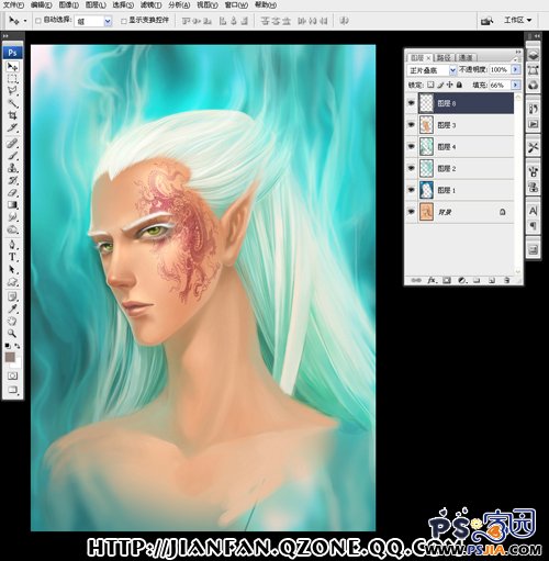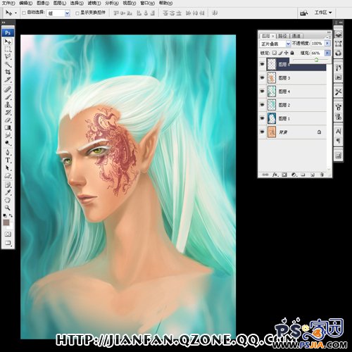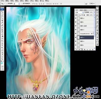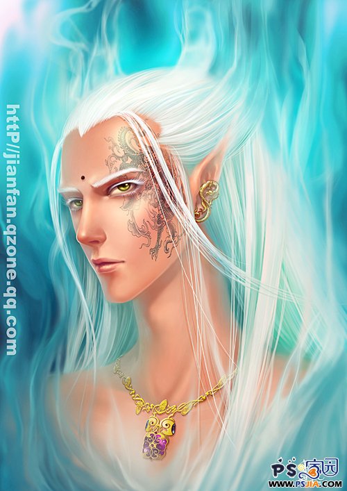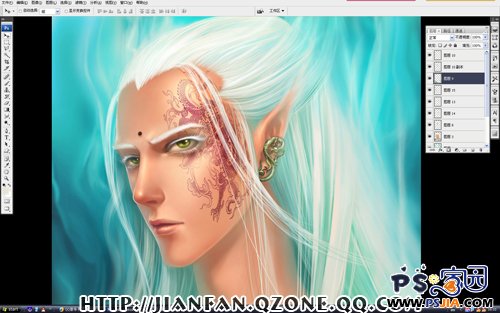 37.再用像皮工具擦掉复盖眼球的部位和轻轻的擦掉高光的部位还有一些边缘的地方。注意观察图39里的变化。让图案与皮肤更容合与自然。 38.在刺青层的上面新建一层,在头额上加了痣,还有把前额的头发和剩下的图发都画完。这样人物就基本完成。 39.在步聚38的图层下面建一层,再进行调整和添加元素。适当的加画上饰品,不会让人物显得太单调。饰品就不放详细绘制过程了,和人物方法一样。注意饰品围绕光来画。 40.对于饰品色彩的调整还是用“色相/饱和度”来调。全图就完成。