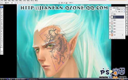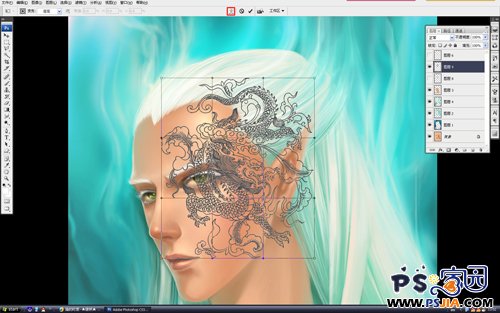 32.慢慢调置,拉动变换框的点和线,按着脸部轮括把图案变换成贴进的形状。 33.然后按“Enter”或双击变换的图形。就确定好了刺青。