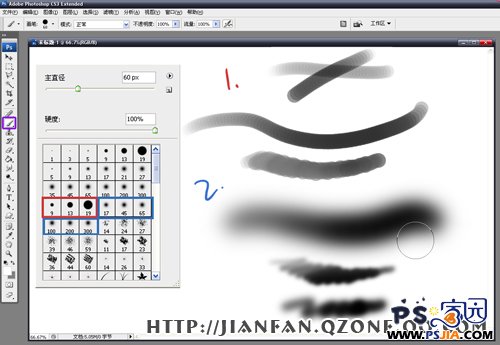 如图1中出来的笔刷框中,有主直径与硬度两个调置,这些都在画画中可按自己要求调设。