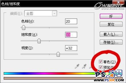 4、调整线稿的颜色。在PS中打开色相饱和度面板,记住一定要把着色打勾!上面的“色相”、“饱和度”和“明度”自己看着调整一下。为了线稿与颜色的融合,上色线稿一般不用纯黑色,但是不同的画风要求不一样,这也不是绝对的。