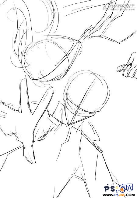 1、线稿。先大致画出你想象中的构图,不需要一上来就仔细勾画细节的线条,那样会很难照顾到整体画面。 |