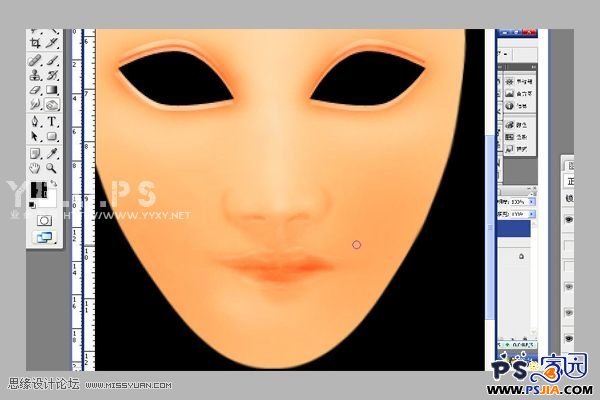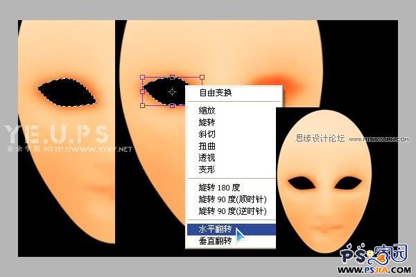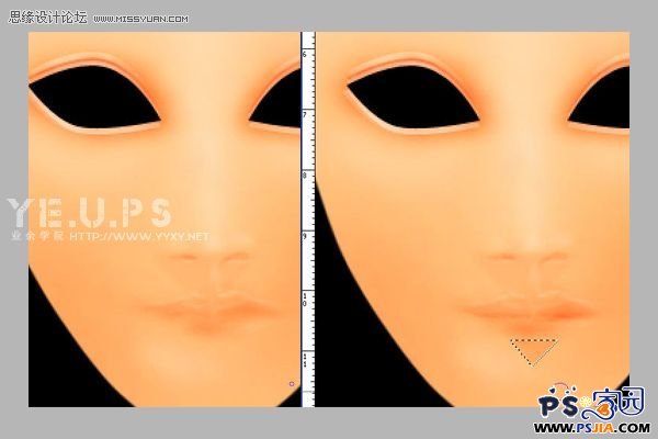 10、路径转化为选区,删除眼眶。水平翻转选区,移动到另一边删除眼眶。不能搞个独眼龙你说是吧。