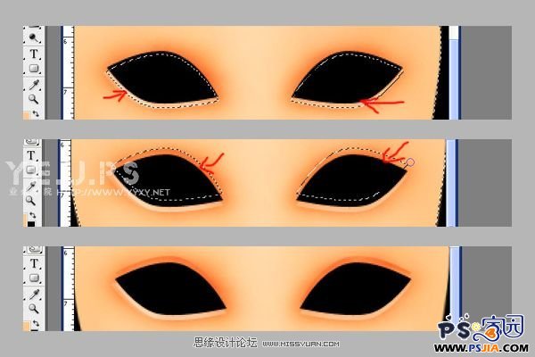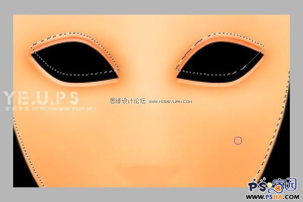 10、路径转化为选区,删除眼眶。水平翻转选区,移动到另一边删除眼眶。不能搞个独眼龙你说是吧。 11、结合选区,使用减淡工具擦出高光部分与双眼皮