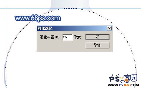 | 6、新建一个图层,用椭圆选框工具拉出下图所示的正圆选区,羽化30个像素后填充白色,效果如下图。 |