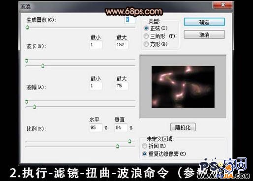 2、执行:滤镜 > 扭曲 > 波浪,参数设置如下图。 |