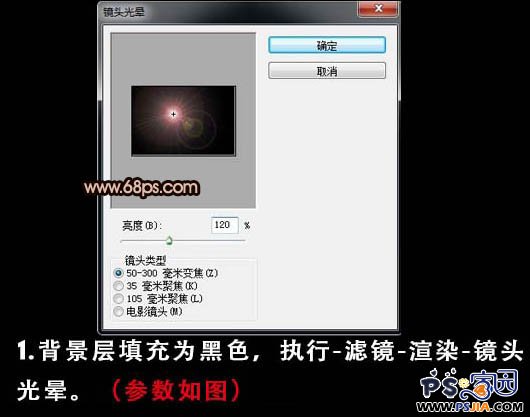 把背景填充黑色,执行:滤镜 > 渲染 > 镜头光晕,参数设置如下图。 |