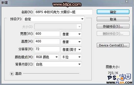 1、新建一个600 * 400像素的文档,具体参数设置如下图。 |