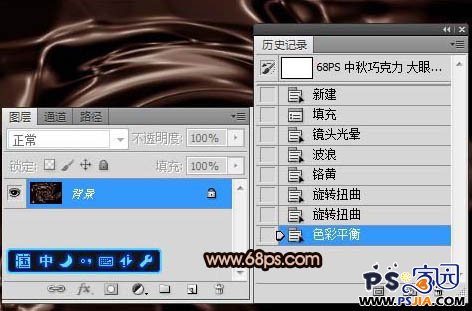 3、再对背景执行:滤镜 素描 铬黄,参数设置如下图。 4、执行:滤镜 扭曲 旋转扭曲,参数设置如下图。 5、按Ctrl + B 调整色彩平衡,对中间调进行调整,