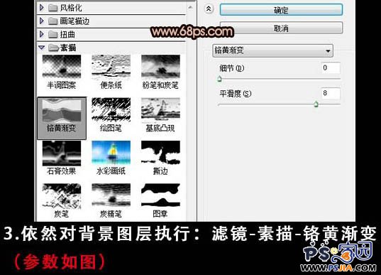 3、再对背景执行:滤镜 > 素描 > 铬黄,参数设置如下图。