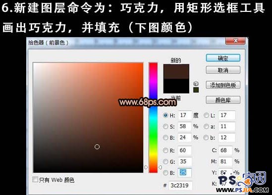 6、新建一个图层,命名为“巧克力”,用矩形选框工具画出下图所示的矩形选区,填充颜色:#3c2319。