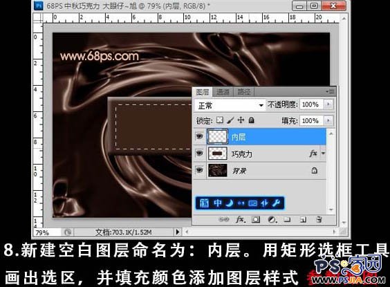 8、新建一个图层,命名为“内层”,用矩形选框工具画出下图所示的选区,填充颜色:#3c2319,然后再执行:图层 > 图层样式 > 斜面和浮雕,参数设置如下图。