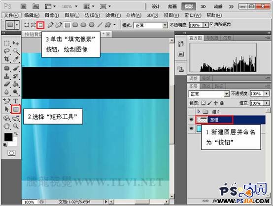 2、新建图层并命名为“按钮”,选择“矩形工具”,单击工具选项栏中的“填充像素”按钮进行绘制。