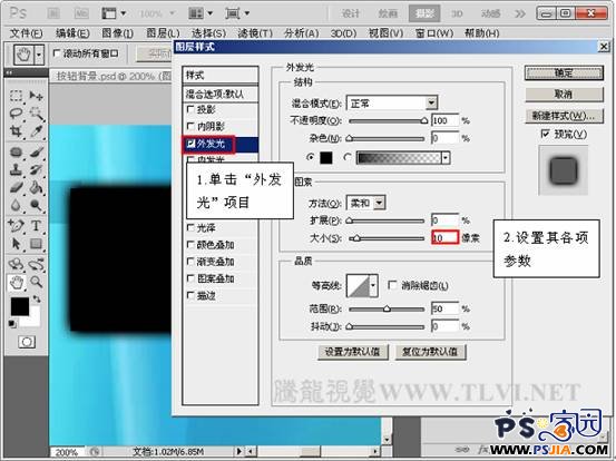3、为“按钮”图层添加图层样式,单击“外发光”项目,设置其各项参数。