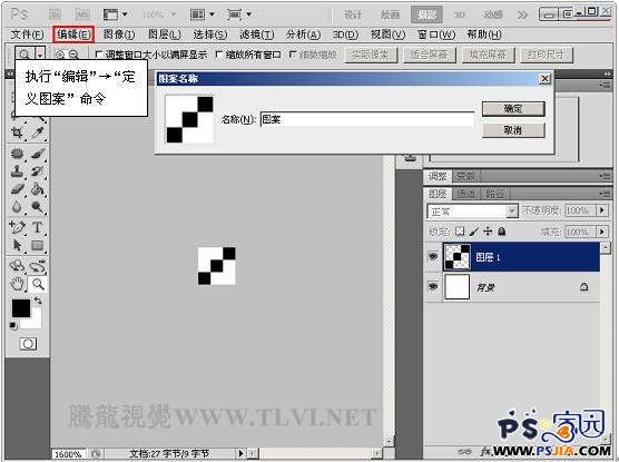 8、新建一个文档,大小为3px*3px,分辨率为72px。将文档放大到1600%,用铅笔画出如下图案,再执行编辑定义图案命令。 9、新建图层并命名为图案,按下C