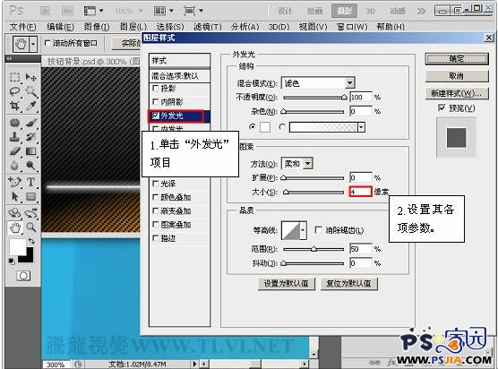 12、为“边”图层添加图层样式,单击“外发光”项目,设置其各项参数。