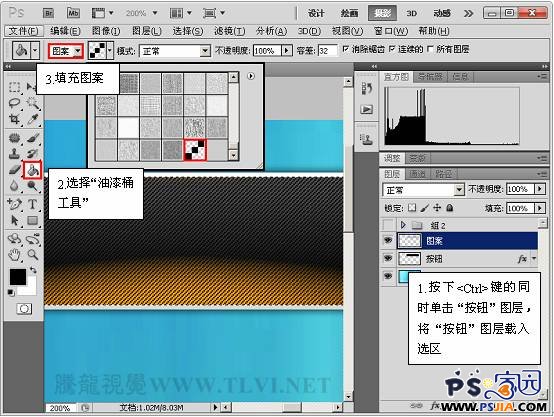 9、新建图层并命名为“图案”,按下<Ctrl>键的同时单击“按钮”图层,将“按钮”图层载入选区,选择“油漆桶工具”填充设置好的图案。