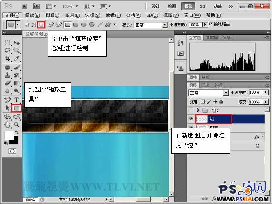 11、新建图层并命名为“边”,选择“矩形工具”,单击工具选项栏中的“填充像素”按钮进行绘制。