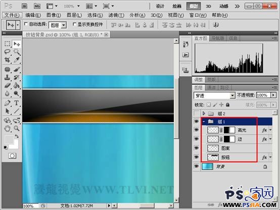 19、新建图层组并命名为“组 1”,分别将 “高光”、“边”、“图案”和“按钮”图层拖入给图层组中。