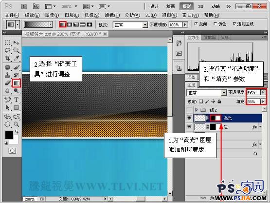 16、为“高光”图层添加图层蒙版,选择“渐变工具”进行调整,并设置其“不透明度”和“填充”参数,完成后效果如图所示。