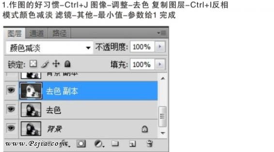 1、作图的好习惯,按Ctrl + J 把背景复制一层。按Ctrl + Shift + U 去色,按Ctrl + J 复制后,按Ctrl + I 反选,图层混合模式改为“颜色减淡”。然后执行:滤镜 > 其它 > 最少值,数值为1。 |