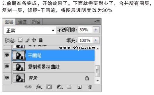 3、前期准备完成,开始效果了。下面就需要耐心了,合并所有图层,复制一层。执行:滤镜 > 艺术效果 > 干画笔,数值自定。确定后把图层不透明度改为:30%。
