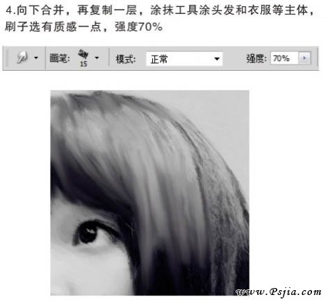 4、向下合并图层,再复制一层,用涂抹工具涂抹头发和衣服等主体,刷子选用质感一点,强度为:70%,如下图。