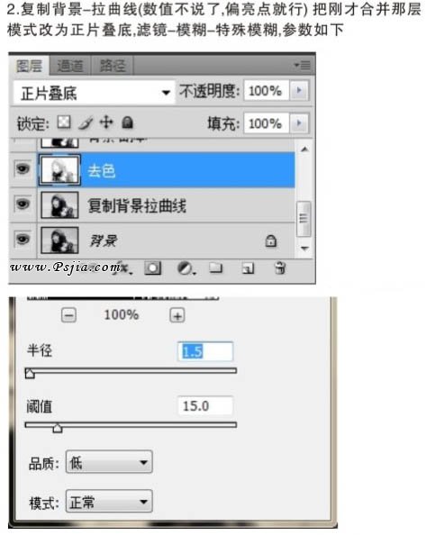 2、把上图所示的“去色”及“去色 副本”图层合并,图层混合模式改为“正片叠底”,执行:滤镜 > 模糊 > 特殊模糊,参数设置如下图。