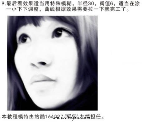 9、最后看效果适当用特殊模糊(滤镜 > 模糊 > 特殊模糊),半径30,阈值6,适当再涂抹一下细节,并用曲线调整一下颜色,完成最终效果。