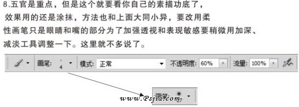 8、五官是重点,但是这个就要看你自己的素描功底了。效果用的还是涂抹,方法也和上面大同小异。要改用柔性画笔。只是眼睛和嘴的部分为了加强透视和表现敏感要稍微用加深,减淡工具调整一下。