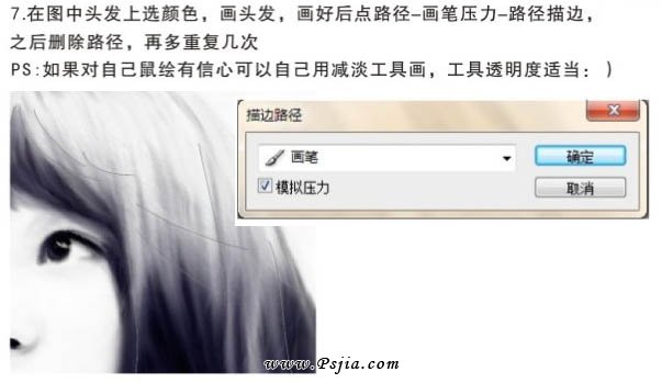 7、在图中头发上选颜色,画头发,画好后点路径 > 画笔压力 > 路径描边,选择画笔。之后删除路径,再多重复几次。