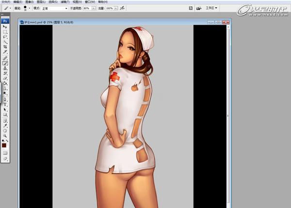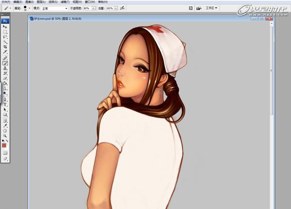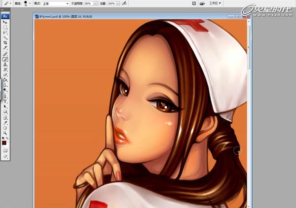 拾取皮肤的固有色,然后调低它的明度和饱和度。慢慢的画出脸上暗部,逐渐向明度过度。这一步比较考验耐心,有些地方可以使用涂抹和模糊工具来帮助增加平滑度。依此类推完成整个身体的润色。(图07)