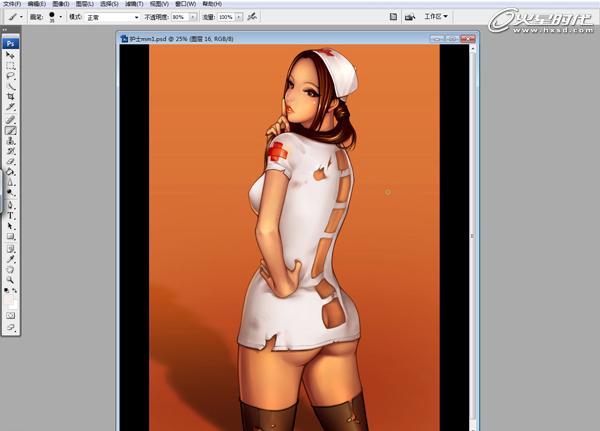 完成了人物的绘画以后再给背景加上颜色。这里我用了一个从橙色到红色的渐变。并为人物加上了投影,这样看上去更自然,画面比较有空间感。(图10)