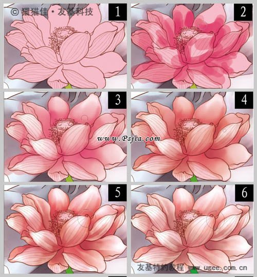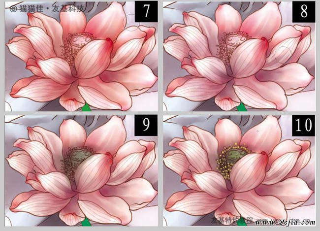 10、荷花:荷花是背景的主要元素,画面中出现的比较多,所以我们在刻画的时候也要耐心些。另外,【荷花图3、4、8】的三种不同颜色我是用“色相/饱和度”和“色彩平衡”调整的。